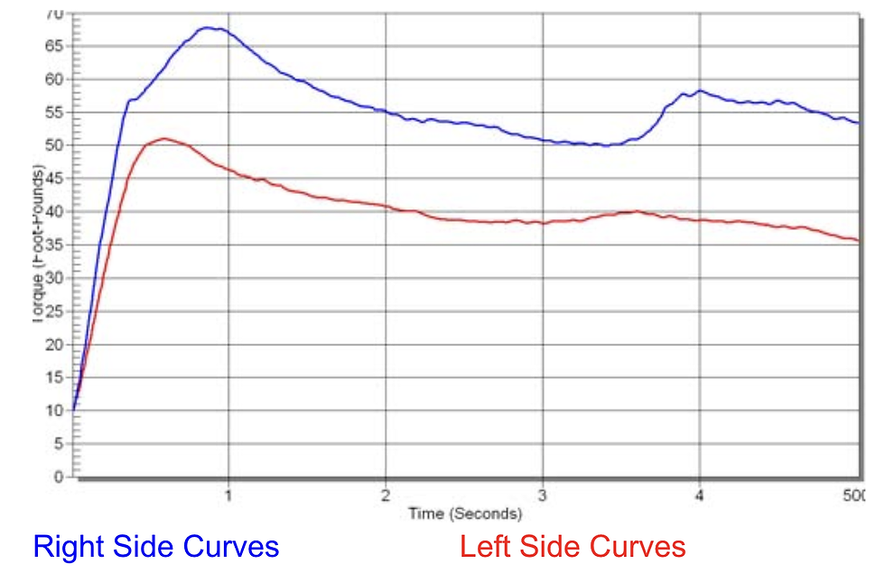 Here you can see the x-axis in the magnitude of force measured in Torque (Ft-Lbs)… but don’t worry about the units if you’re unsure what a Ft-Lb is, think of it just as force and make a note to check my previous blogs on torque (I talked about Newton-Metres in these blogs, Ft-Lbs is just the weird imperial, American metric for torque! Like inches instead of centimetres). On the y-axis is time in seconds.