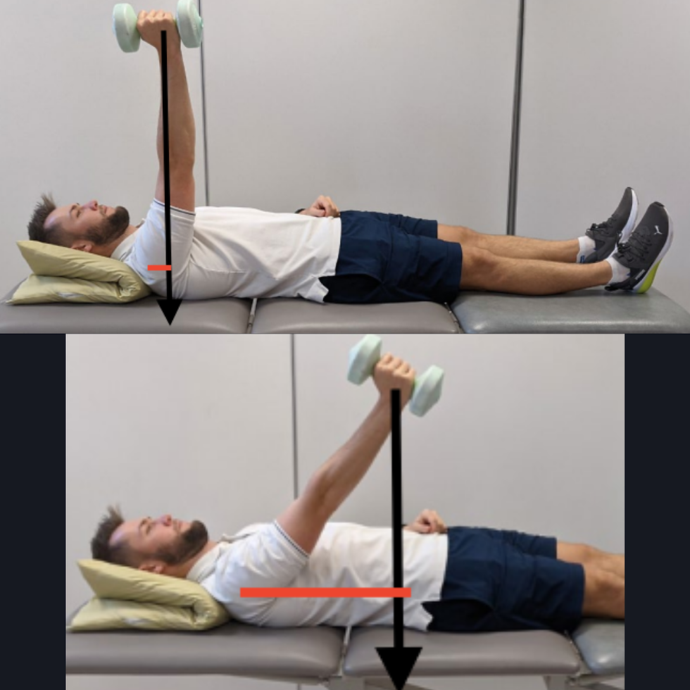 The picture below is a picture in the starting position followed by a snapshot of the exercise where you move the weight forwards and backwards, you can see the more you ask them to move the weight forwards / backwards, the greater the moment arm (in red) is leading to a larger external shoulder extension moment! When you ask someone to increase the distance they move the weight, this is part of the biomechanics behind it!
